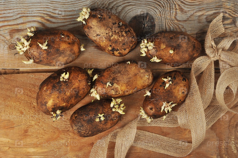Бутоны картофеля с прорастающими побегами на деревянном фоне
