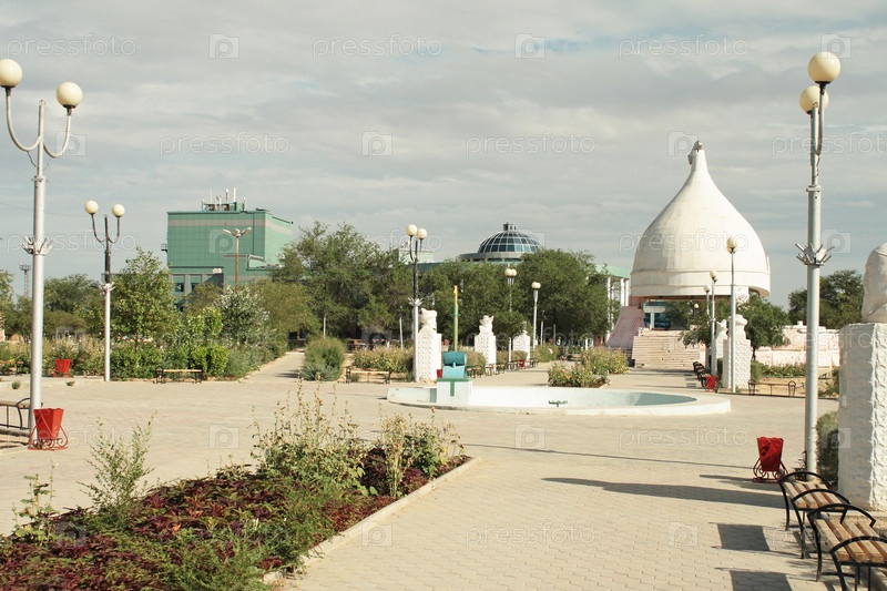 Арка и шлем на центральной площади города. Город Нью-Узень. Казахстан