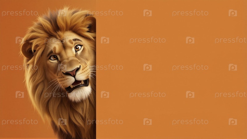 Красиво иллюстрированный лев смотрит за оранжевым фоном, показывая свои выразительные глаза и великолепную гриву