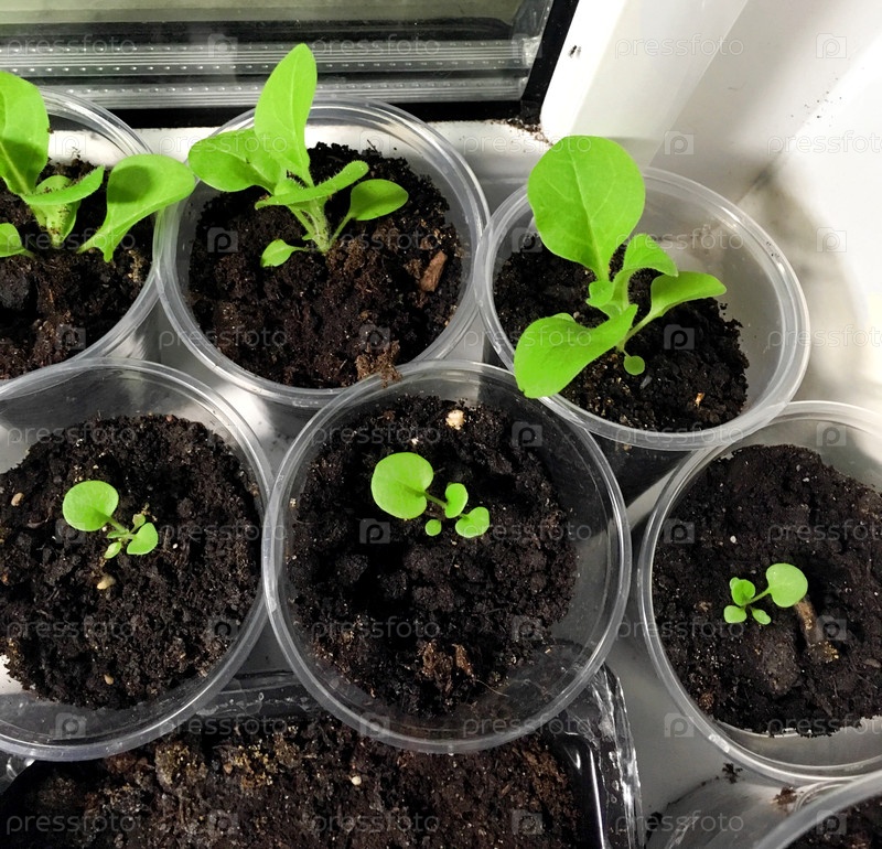 Пластиковые чашки с саженцами петунии стоят на подоконнике
