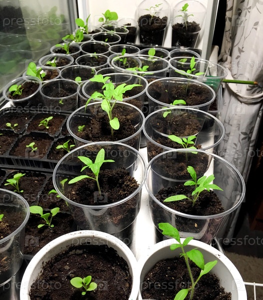 Саженцы помидоров в пластиковых чашках находятся на подоконнике