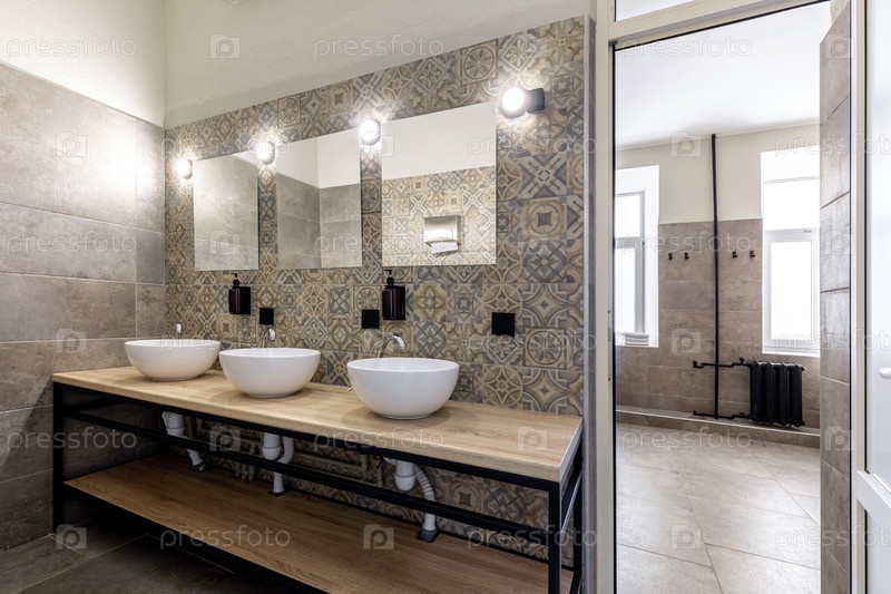 Интерьер общей ванной комнаты хостела с тремя белыми раковинами судна на деревянном стойке. Стильные узочные плитки, большие зеркала со лампами и открытый вид в коридоре с окнами. Современный дизайн промышленного лофта для путешественников