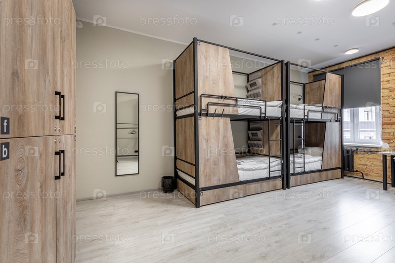 Внутренний вид современного номера общежития с рядами двухъярусных кроватей с деревянными панелями конфиденциальности и железной металлической рамой.Комната включает соответствующие деревянные шкафчики, настенное зеркало, легкий ламинированный пол и больш