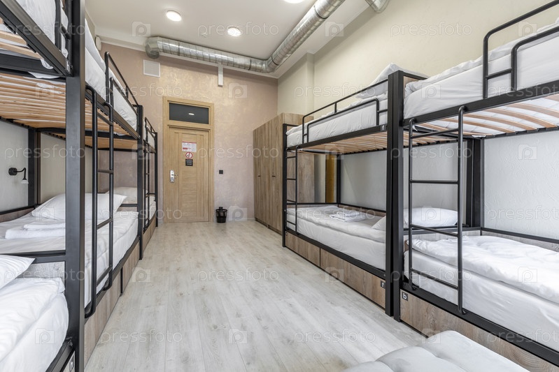 Современный интерьер хостела с четырьмя черными металлическими двухместными кроватьми с деревянными панелями и белым постельным бельем.Комната включает в себя высокий деревянный гардероб, легкий ламинированный пол и промышленную вентиляционную трубу на по