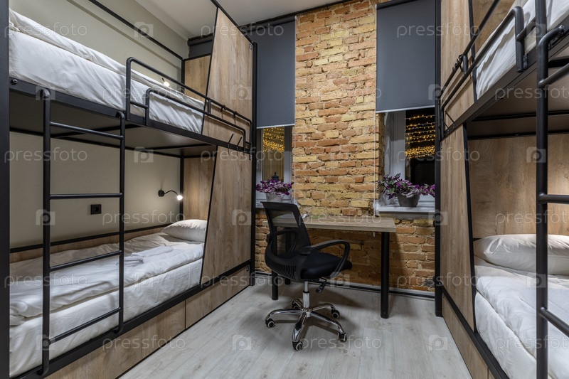 Интерьер современного общежития в стиле лофт ночью.В нем расположены деревянные многоэтажные кровати с металлическими рамами, рабочее пространство со столом и стулом и открытой кирпичной стеной.Большие окна с серыми жалюзи показывают праздничные огни горо