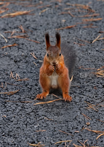 Дикая красная белка, которую кормят посетители парка в прохладное осеннее утро