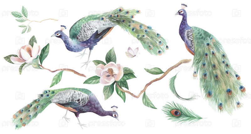 Коллекция акварелей 'Пауны и Магнолия'. Иллюстрация акварели. Иллюстрация ручной акварели. Для дизайна упаковки, карт, обложки, обоев, принтов, этикеток на продуктах и ткани