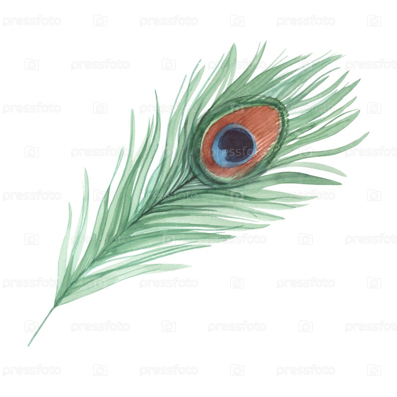 Перо павлина. иллюстрация акварельных красок ручной работы. для дизайна упаковки, карт, обложки, обоев, печатных работ, этикеток на продуктах и ткани