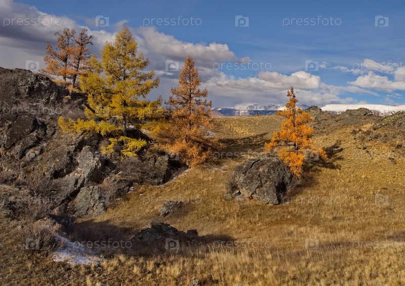 Юг Западной Сибири, Алтайские горы.Глубокая осень в степи Курай на живописных скалистых местах, окруженных желтыми личинками вдоль Чуйского тракта