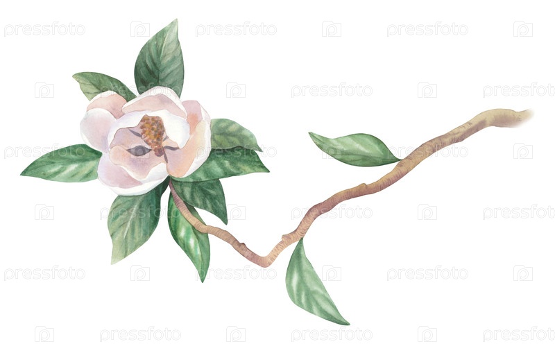 Магнолия в цвете. Илюстрация акварели. Иллюстрация ручной акварели. Для дизайна упаковки, карт, обложки, обоев, печатных работ, этикеток на продуктах и ткани