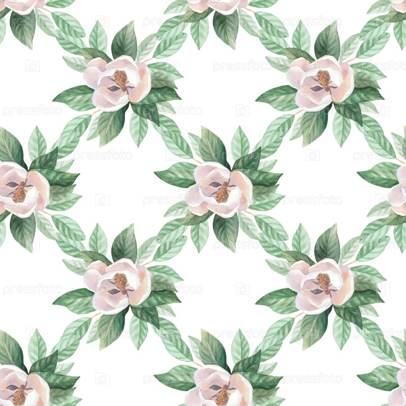 Бесшовный рисунок цветущей магнолии. Иллюстрация акварельных красок ручной работы. Для дизайна упаковки, карт, обложки, обоев, печатных работ, этикеток продуктов и ткани