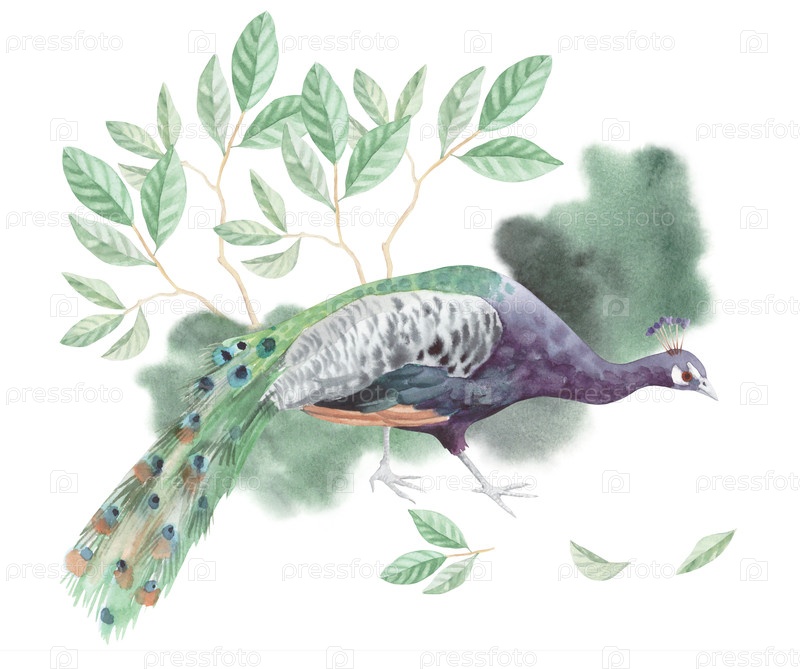 Композиция павлина, идущего по траве с ветвями магнолии на заднем плане. Иллюстрация акварели. Для дизайна упаковки, карт, обложки, обоев, печатных работ, этикеток продуктов и ткани