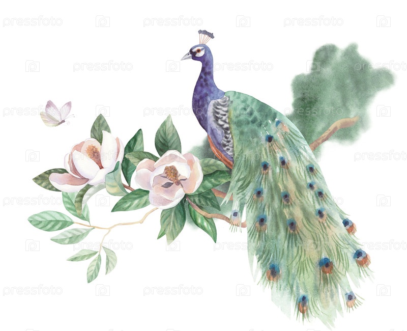 Воронка сидит на ветке магнолии с бабочкой и зеленой пятной в фоне. иллюстрация акварели ручной работы. для карт, обложек, обоев, принтов, этикеток продуктов и ткани