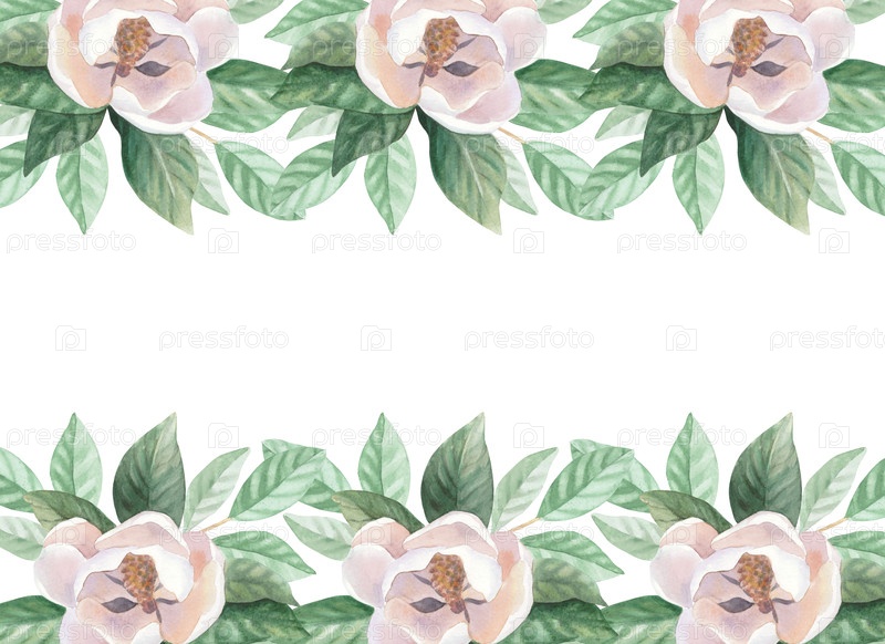 Горизонтальная рама бутонов и листьев магнолии. Иллюстрация акварельных красок ручной работы. Для дизайна упаковки, карт, обложки, обоев, печатных работ, этикеток на продуктах и ткани