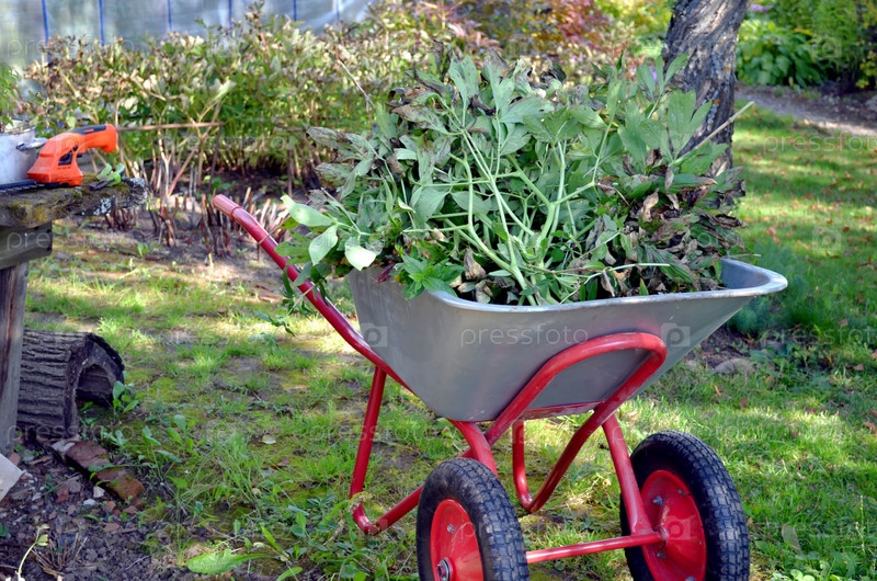 Обрезание сухих стеблей и листьев осенью в цветочном саду. уход за клумбами