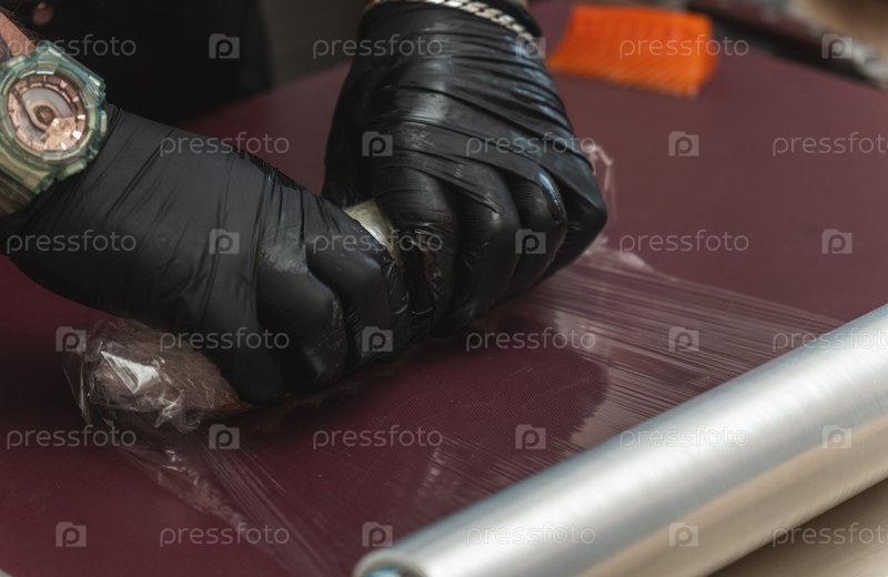 Шеф в черных перчатках плотно переворачивает пластиковую оболочку над свежим лососем суши-ролл на рис на профессиональном кухонном столе, ближайший взгляд