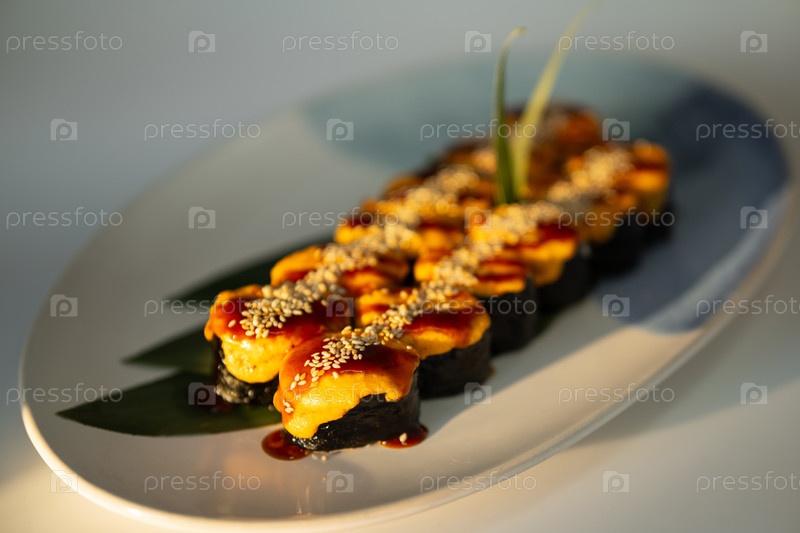 Выпеченные рулоны суши, покрытые расплавленным сыровым соусом, териаки и кунжутными семенами подаются на бамбуковых листьях на белом блюде