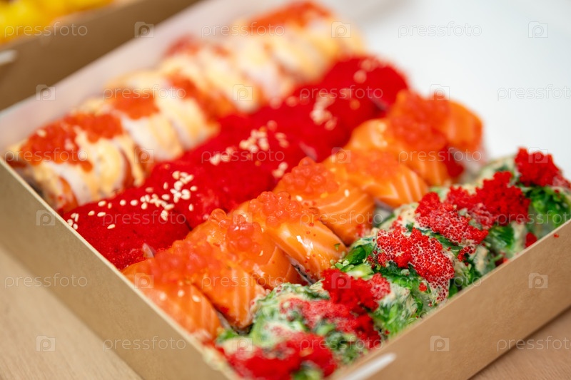 Ассортимент красочного суши с выбором лососевого ролика, икры и салата из морских водорослей в картонной коробке для приема на деревянном столе, близкий взгляд