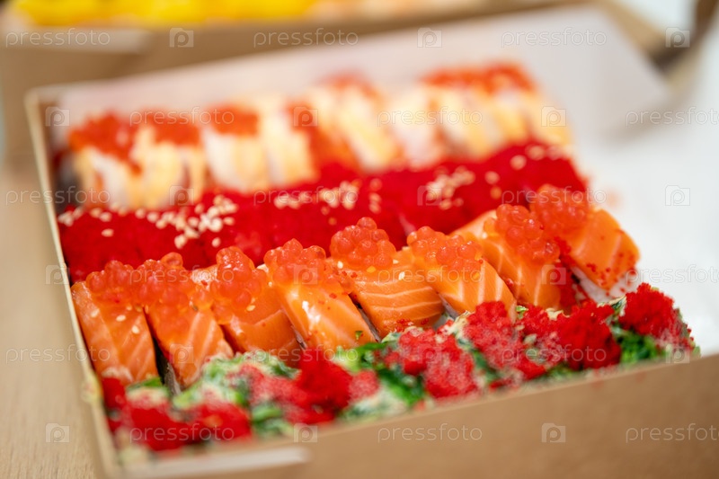 Ассортимент красочного суши с выбором лососевого ролика, икры и салата из морских водорослей в картонной коробке для приема на деревянном столе, близкий взгляд