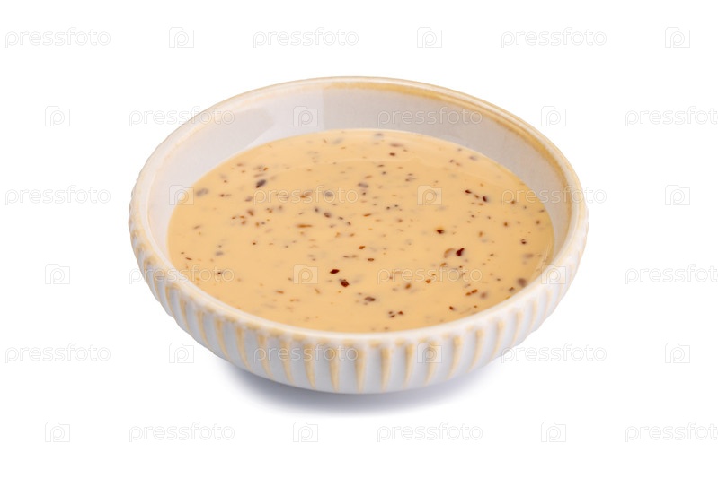 Кремный кунжутный соус с чили и специями в белой керамической миске, изолированной на белом фоне