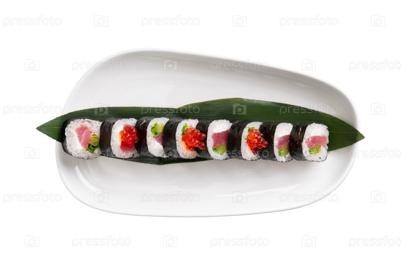 Вид сверху на суши-туна мака с иконой лосося и зеленым луком подается на бамбуковом листе на белой овальной тарелке, изолированной от белого фона