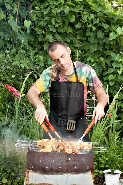 Мужчина грилл угольный барбекю на открытом воздухе в пышной летней садовой обстановке, классической пикник-сцене или вечеринки на выходных