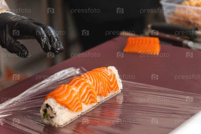 Черный шеф-повар с перчатками готовит свежее суши из лосося на пластиковой упаковке над доской для резки в профессиональной кухне, ближайший снимок