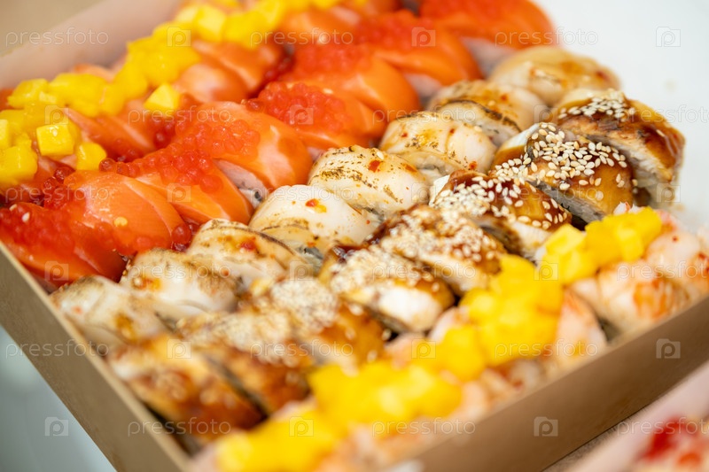 Ассортимент суши-руллов в коробке на вынос с лососем, угорьем, креветками, манго, кунжутом и соусом, захваченный красочным крупным планом, подчеркивающим свежее японское блюдо и гурманские представления