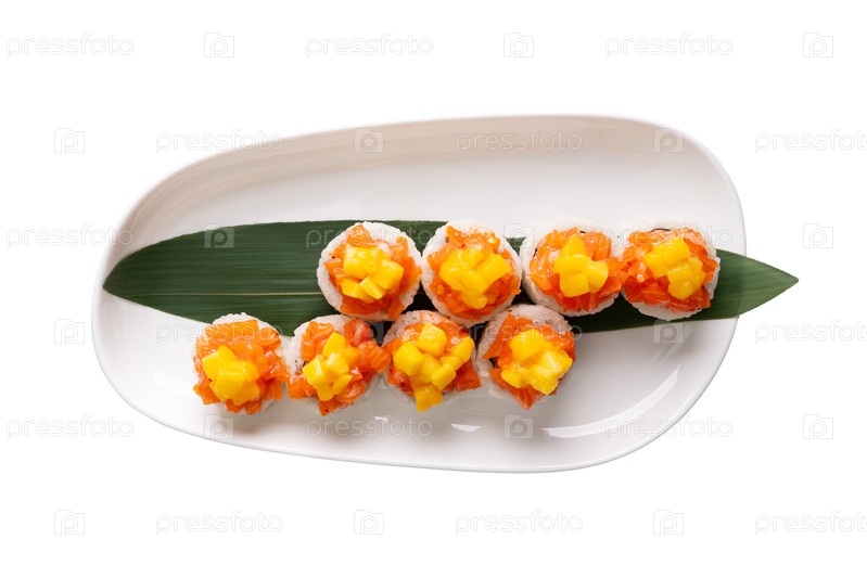 Вид на суши лосося и манго на рисе, подаваемом на бамбуковом листе на белой овальной тарелке, изолированной на белом фоне