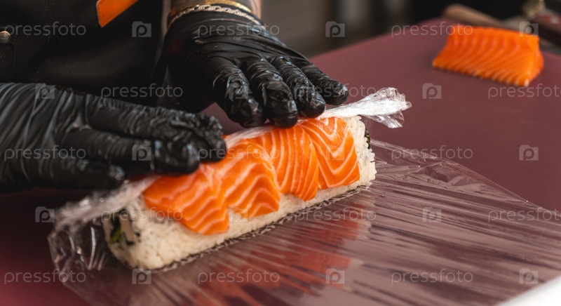 Шеф в черных перчатках плотно переворачивает пластиковую оболочку над свежим лососем суши-ролл на рис на профессиональном кухонном столе, ближайший взгляд