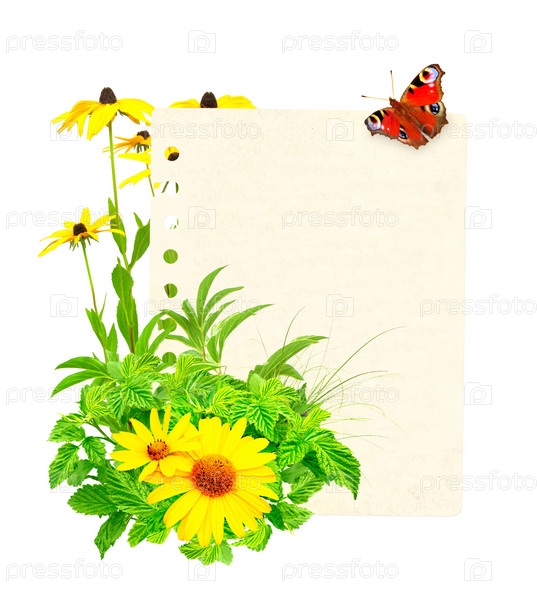 Зеленая трава, цветы и бабочка