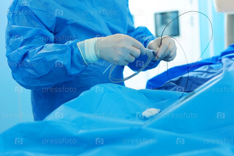 Удаление сгустков крови. Работа хирурга. Хирургия кровеносных сосудов. Концепция здравоохранения. Руки в крупном плане