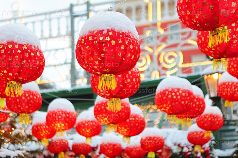 Красные китайские огни в снегу. Китайский Новый год. Праздник нового года. Пустыня. Улица зимой