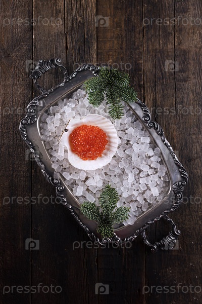 Красный икры на подносе. Икри лосося лежит на раковине и на льду. Ветви ели. Праздничная закуска. Винтажная палитра. Деревянный фон. Вид сверху. Копировать пробелы