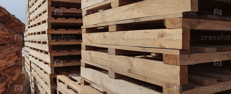Деревянные поддоны. Укладка деревянных поддонов. Концепция грузовых и судоходных перевозок. Древесные поддоны для транспортировки строительных материалов. Узкий баннер
