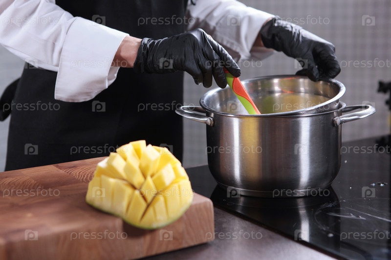 Повар делает манговый соус. Зрелый манго для соуса. Горшок на плите. Густой соус для рыбных блюд или салатов