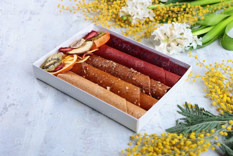 Набор фруктовых пастилей в коробке. Пастилы в ассортименте. Подарок на день рождения. Весенние цветы мимозы. Сладкий десерт без сахара. Весенние цветки мимозы. Концепция здорового питания