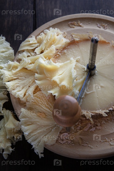 Традиционный альпийский сыр Tete des Moines, подаваемый на деревянной доске