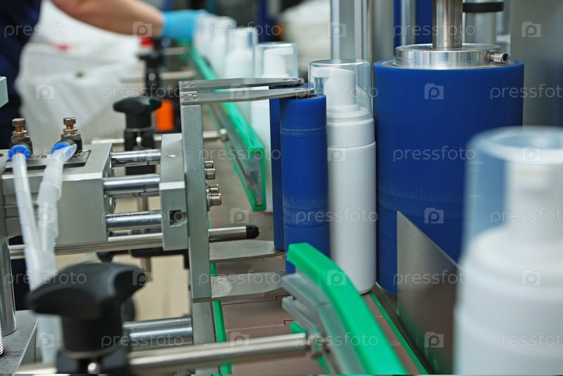 Бутылки без ярлыков на сборочной линии косметической фабрики Производство косметики и средств по уходу за кожей Белая пластиковая бутылка