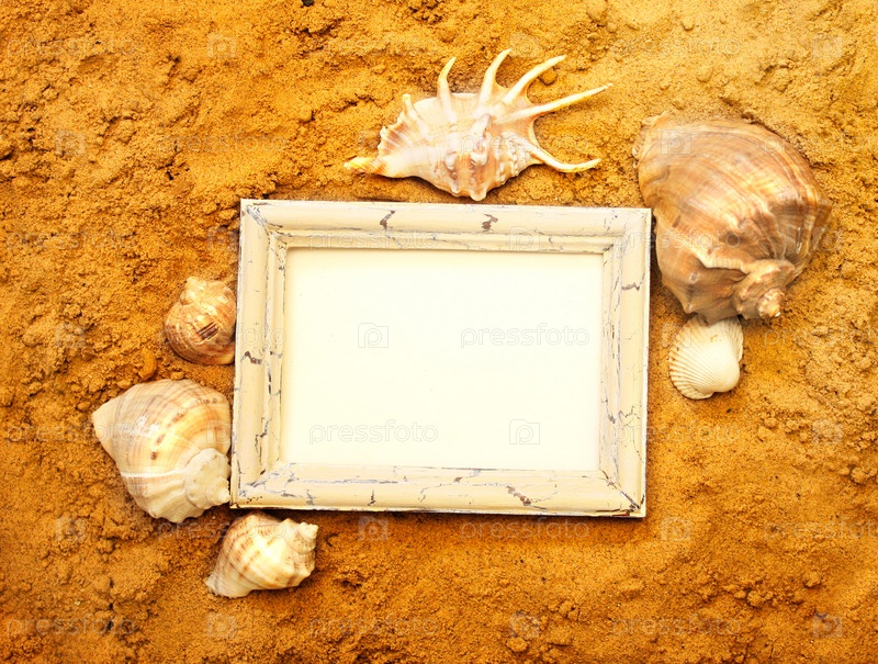 Ракушки и деревянная рамка на песке
