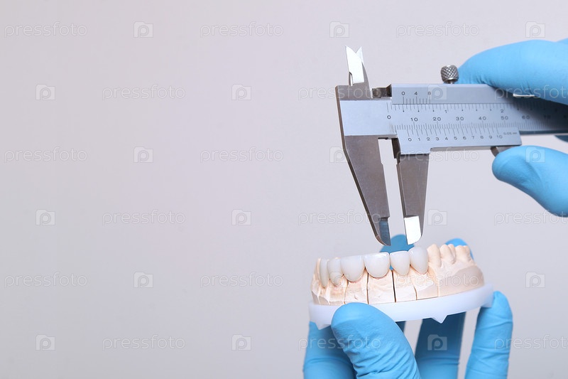 Керамические и композитные фанеры. Стоматолог измеряет фанеры. Руки в защитных перчатках. Концепция красоты и здоровья. Закройте. Копировать пространство