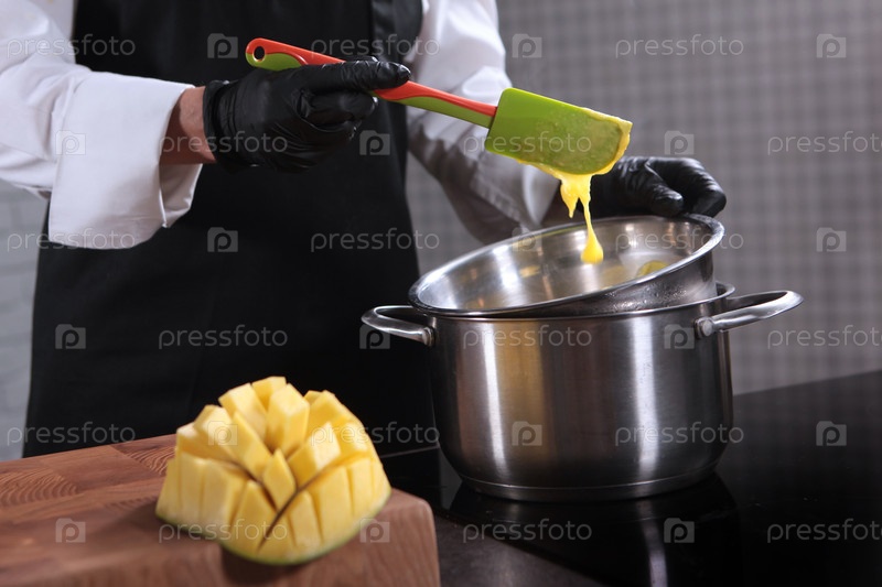 Повар готовит соус на кухне. Зрелые манго для соуса. Кастрюля на плите. Густой соус для рыбных блюд или салатов