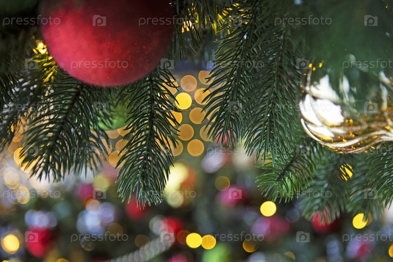 Ветка рождественской елки украшена красными и золотыми шарами. История новогодней открытки. Красный шар на дереве. Новогодний боке