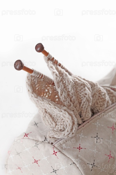 Иглы для вязания шерсти и бамбука есть в сумке. мешок хранения ремесла. Мое хобби - вязание. аксессуары к вязанию. белый фон. изолированный объект