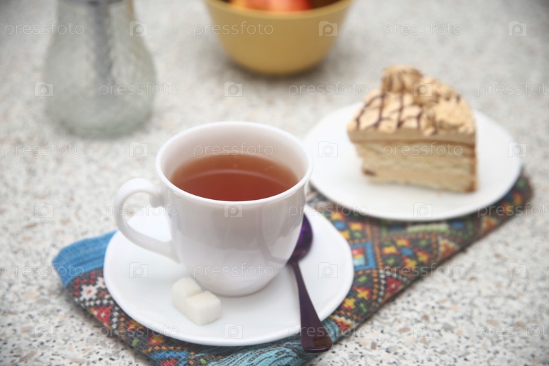 Чашка черного чая и кусок карамельного торта