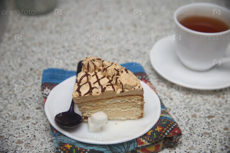 Кусок карамельного торта с шоколадной глазуркой на столе