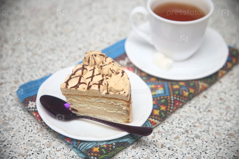 Кусок карамельного торта с шоколадной глазуркой на столе