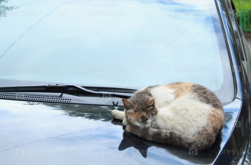 Спящий кот на капоте машины