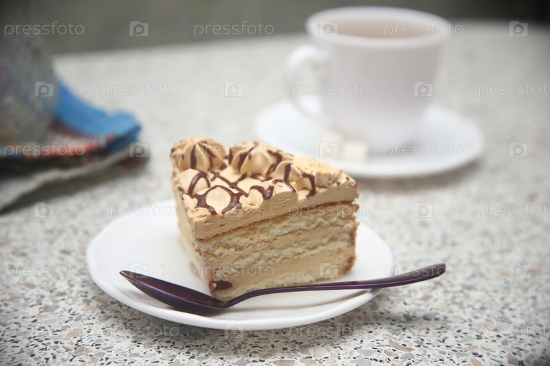 Кусок карамельного торта с шоколадной глазуркой и чашка на столе