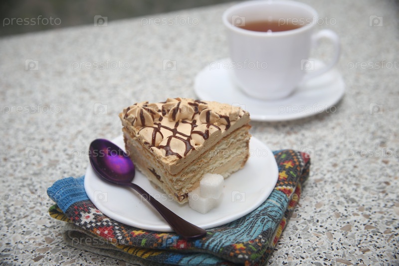 Кусок карамельного торта с шоколадной глазуркой на столе